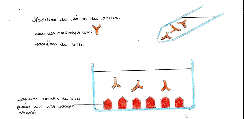 Si le patient est contaminé par le virus du SIDA, son sang contiendra des anticorps anti-VIH qui se seront formés pour combattre l’infection. Ces anticorps vont reconnaître les protéines virales fixées sur la plaque alvéolée et ainsi se lier à celles-ci.