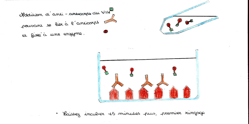 Dans le cas d’une contamination, ces anti-anticorps et leurs enzymes vont se lier aux anticorps anti-VIH déjà accrochés dans l’étape précédente.