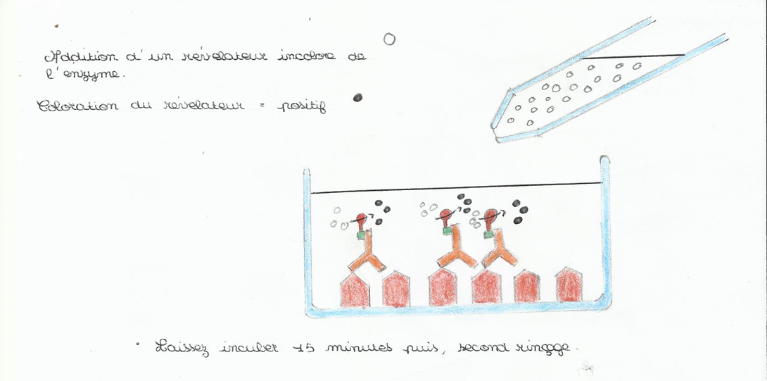 Etape 3 : On ajoute ensuite le révélateur incolore de l’enzyme reliée aux anti-anticorps.