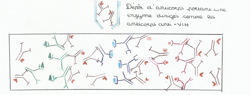 Si le patient est contaminé et que son sérum contient ces protéines virales du virus du VIH, alors l’enzyme transforme le substrat par un produit coloré. C’est ainsi que s’explique l’apparition de bandes colorées sur le buvard de nitrocellulose.