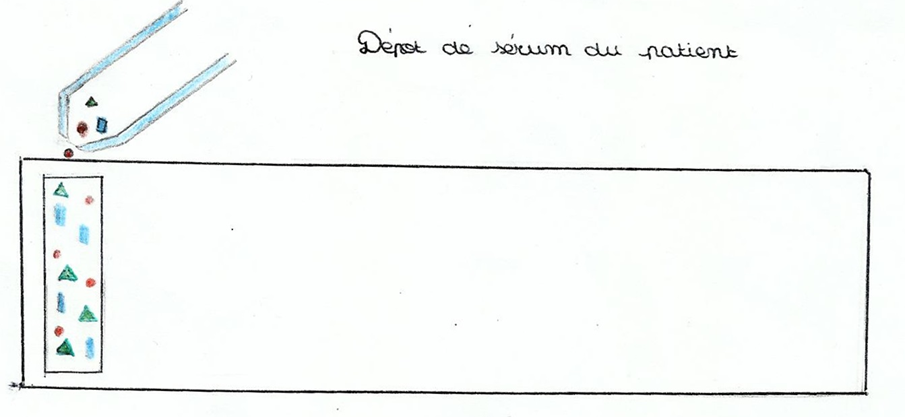 - Etape 1 : Suite à une prise de sang, on prend le sérum1 du patient contenant trois protéines différentes du VIH. On dépose le sérum sur une bande d’électrophorèse.