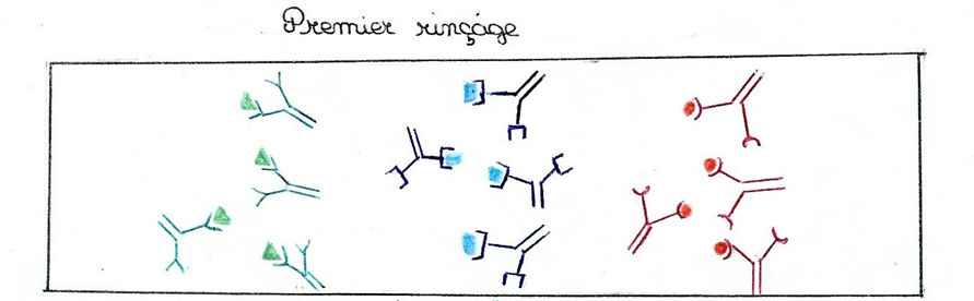 - Etape 5 : On procède à un premier rinçage où seuls subsistent les anticorps ayant fixé une protéine virale.