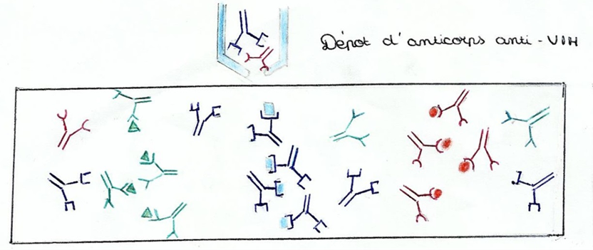 - Etape 4 : On dépose ensuite des anticorps anti-VIH qui sont produits en laboratoire, car le patient n’en a pas ou pas encore. On évite ainsi le problème de la fenêtre sérologique connu avec le test Elisa.